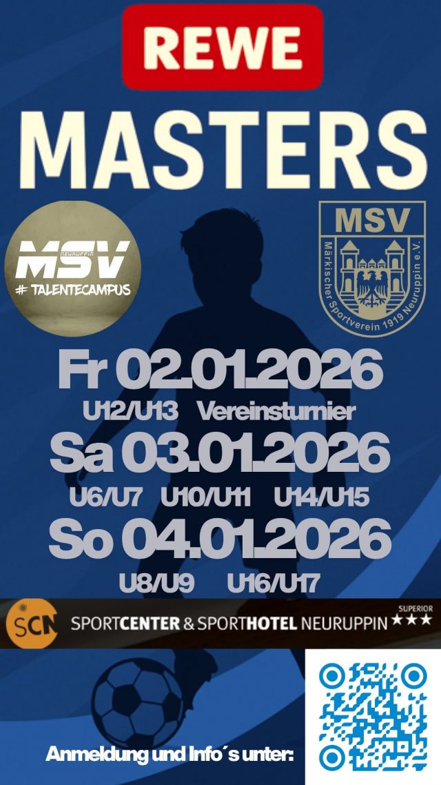 Am ersten Wochenende des neuen Jahres (02.-04.01.26) findet das Rewe-Masters in Neuruppin statt. Der MSV lädt zu spannenden Spielen in das Kaatsch-Sportcenter ein – und freut sich über Leistungsvergleiche mit anderen Mannschaften aus der Region. Von den Bambinis bis zur B-Jugend werden alle Jahrgänge vertreten sein. Neben dem sportlichen Wettkampf stehen vor allem der Spaß und die Freude am Spiel im Vordergrund.