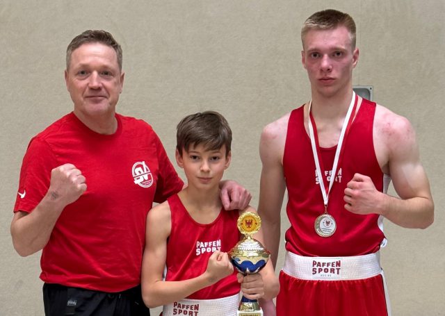 Christian Konrad (12 Jahre / Bildmitte), Abdul Stanikzai (15 Jahre) Tim Irrgang (18 Jahre / Bild rechts) und Nino Rinkau (38 Jahre) vertraten den MSV 2025 bei den Deutschen Box-Meisterschaften in Lindow sowie bei den Landesmeisterschaften in Velten erfolgreich: Zur Freude von Trainer Mike Schultz (Bild links) holten alle vier Athleten Spitzentitel in ihren jeweiligen Altersklassen. Christian Konrad wurde Landesmeister sowie Dritter Deutscher Meister (Kadetten), Abdul Stanikzai wurde Vizelandesmeister (Junioren), Tim Irrgang wurde Vizelandesmeister (Jugend) und Nino Rinkau wurde Landesmeister (Elite). Herzlichen Glückwunsch den Siegern und Danke an die Trainer Mike Schultz, Mandy Scholz und Eike Lamprecht für die erfolgreiche Arbeit!