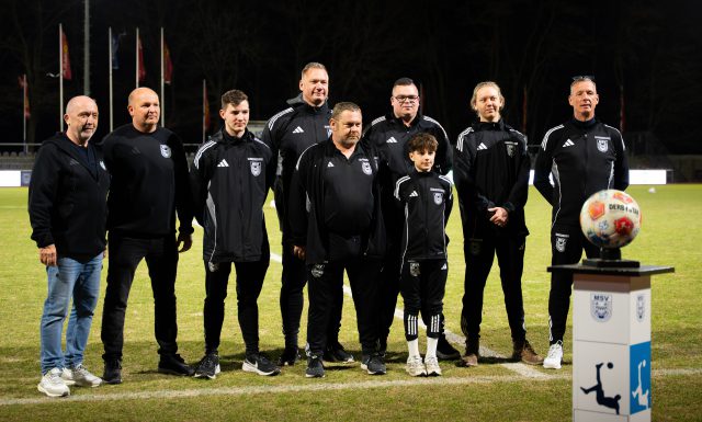 Der MSV kümmert sich auch um seine Schiedsrichter! Während es andernorts immer schwieriger wird, Schiedsrichter für die Aufrechterhaltung des Spielbetriebs zu gewinnen, hat der MSV mehrere neue Kollegen in seinen Reihen begrüßen können. Vor allem Schiedsrichterobmann Marcel von Boguschewski (rechts) engagiert sich für die Gewinnung und Motivation neuer Kolleginnen und Kollegen. Dafür dankten ihm kürzlich Präsident Thomas Huch (links) und Abteilungsleiter Fußball, Sven Neumann (2.v.l.), anlässlich der Vorstellung aller neuen MSV-Schiedsrichter im Volksparkstadion. Bei der Gelegenheit wurden die Schiedsrichter auch mit kompletter Trainingskleidung ausgestattet.